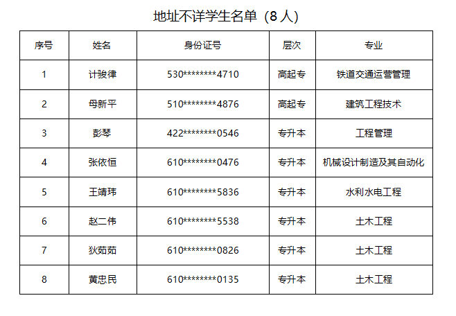 我校2021级新生入学通知书已全部发放,目前尚有8名学生因通讯地址、电话不详,无法与本人取得联系。现将该8人名单公布如下,请见到通知后,尽快与我院招生办公室联系领取新生录取通知书,并于3月20日到校本部报到。逾期未报到者,一律取消入学资格。